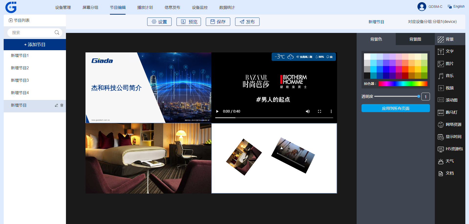新建好一个节目后,在页面右侧选择素材来完成节目内容的编辑,素材类型可使用网络资源素材(如:链接、背景图/色、天气、时间等)和上传本地素材(如:图片、视频、文档、 H5 等)。