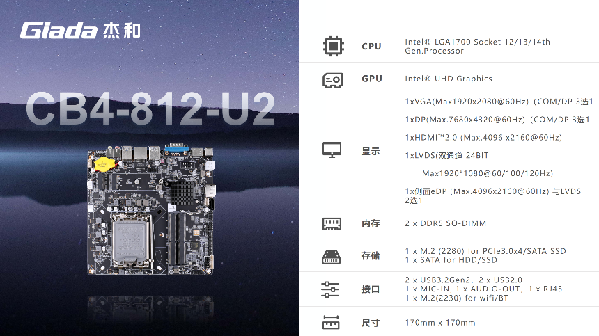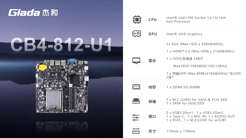 米兰·(milantiyu)科技一体机主板基于X86架构设计,具有良好的兼容性与性能表现,均采用Thin mini-ITX 170mm*170mm尺寸规格设计,在紧凑机身中实现功能集成与空间优化。接下来,我们从实际需求出发,为您提供选型推荐。