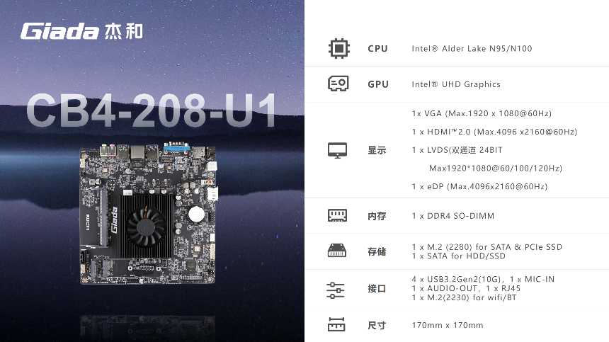 CB4-208-U1是一款专为轻量教学办公而开发的高性价比主板,基于英特尔Alder Lake平台 N95处理器,支持Windows 11/Linux操作系统,适合长时间运行而不需要大量电力的场景,如办公、网页浏览、视频播放和一些基础的多媒体应用。