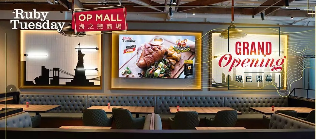 在现代商业中心,各式各类的广告随处可见,数字广告已成为商业广告的主流形态。顾客走进Ruby Tuesday连锁餐厅,一定会被它超大屏幕的高清数字广告所吸引,动态炫目的画面着实吸引眼球。现如今,数字智慧广告已成为各大品牌门店吸引客流的重要工具。