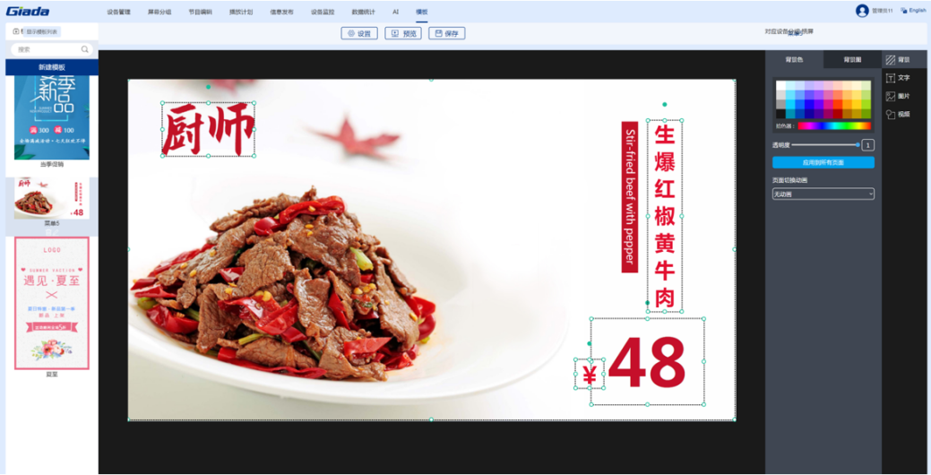 米兰·(milantiyu)科技智慧餐厅综合解决方案是由智能零售管理系统搭载公司自研的数字标牌播放器组成的软硬件一体化方案。该系统针对餐厅、酒店等不同行业提供典型节目模板,支持手机、电脑建议操作。用户只需3步即可完成节目的制作播放:选择节目模板,更换自己的素材(视频、图片和文字),预览保存及播放。价格、优惠折扣等信息可随时更改。