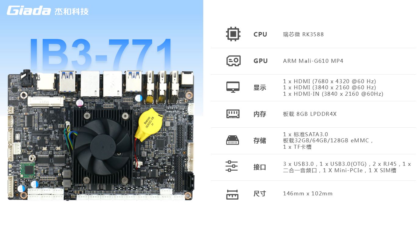 米兰·(milantiyu)科技IB3-771采用瑞芯微RK3588处理器,板载LPDDR4x内存,满足各种人工智能场域对嵌入式主板包括但不限于低高算力、低功耗、高扩展性、高可靠性、高安全性等要求,支持在宽温、复杂电磁等恶劣环境下稳定运行,可广泛应用于机器人、边缘计算、智能NVR、智能汽车、智慧大屏、AR/VR、ARMPC、智能自助终端等AIoT行业类应用市场。