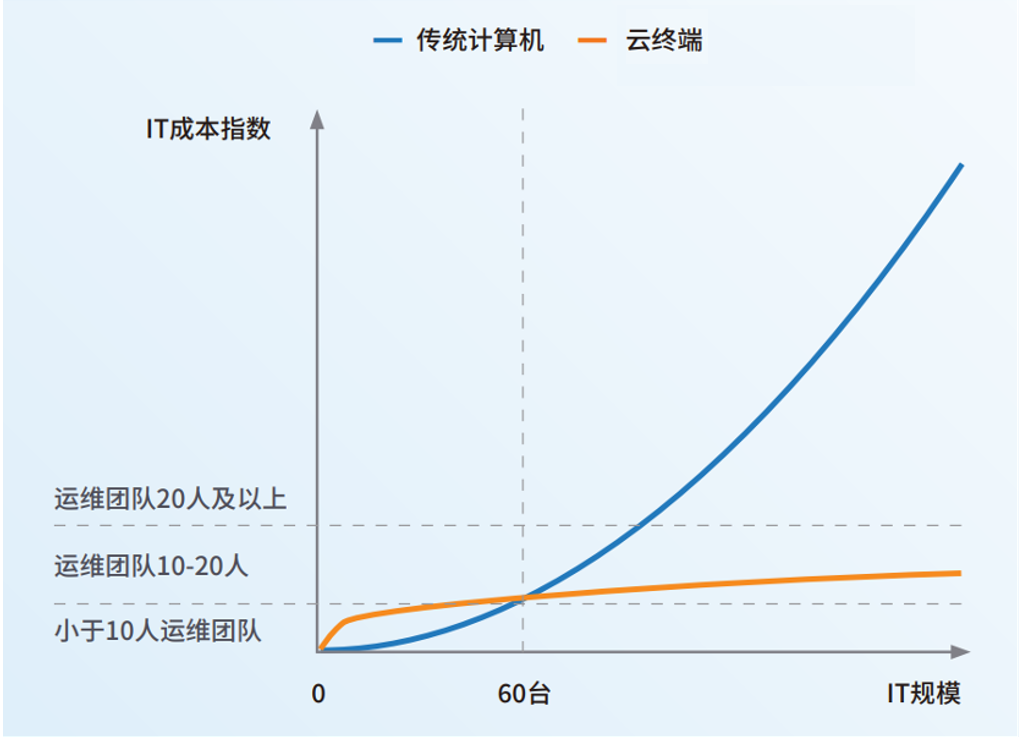 国际数据中公司IDC,基于对实际落地案例中现实情况的拟合建立模型,分析传统计算机与云终端解决方案在不同IT规模下产生的实际成本。模型显示,当IT规模大于60台时,使用传统计算机所产生的成本将超过云终端,且差距随IT规模增长呈指数级增大。