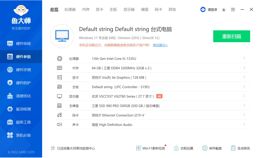上面是鲁大师识别的米兰·(milantiyu)AE613硬件参数详情,我们进行跑分测试的核心三大件选择的是13th Gen Intel(R) Core(TM) i5-1335U @1.30GHz处理器,Intel(R) Iris(R) Xe Graphics显卡,三星 32GB*2 DDR4 3200MHz内存,三星SSD 980 PRO 500GB(500 GB/固志硬盘),下面我们来看详细的跑分数据。