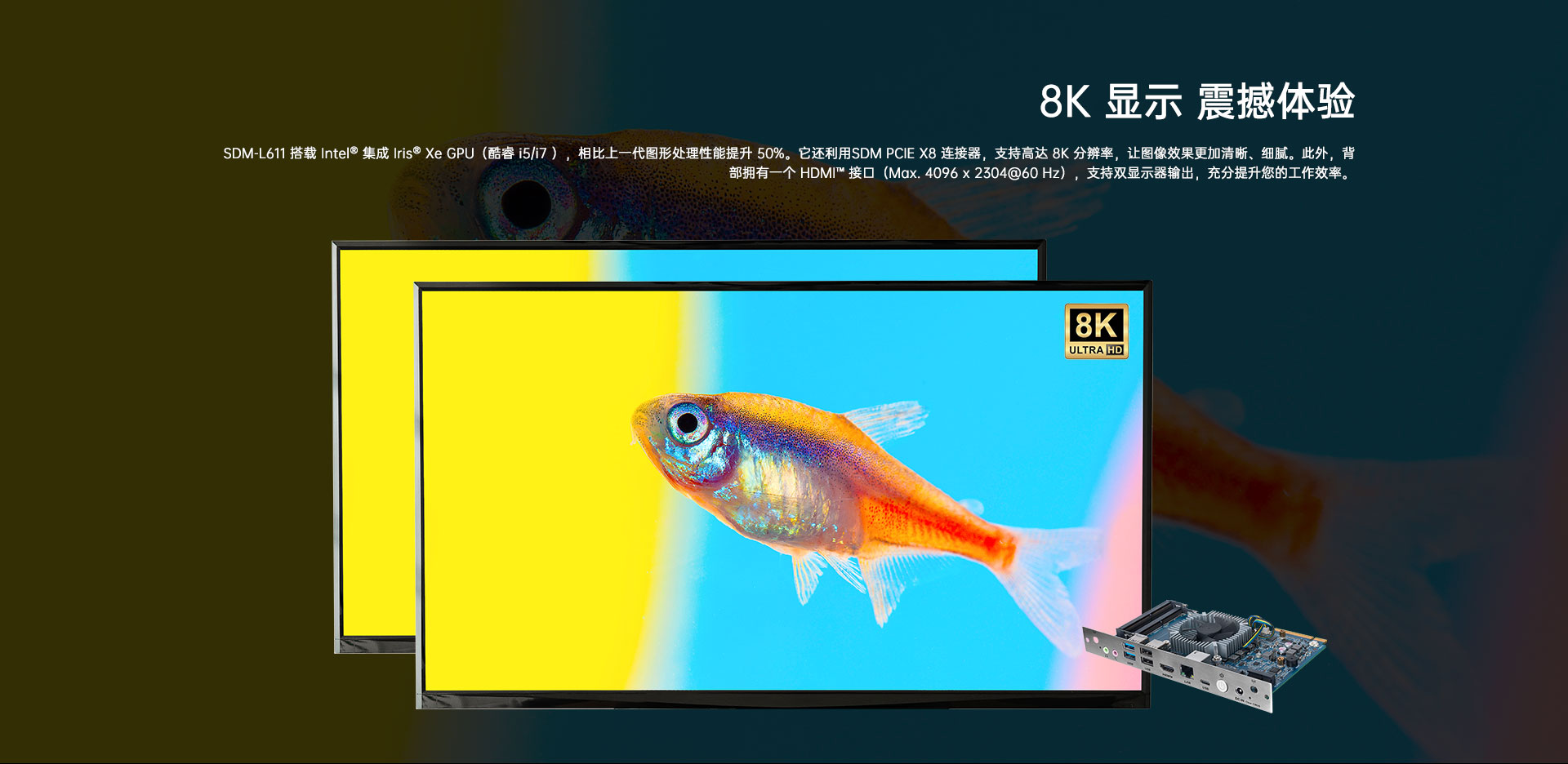 1 x  DP, 1 x HDMI显示,支持4K60Hz输出,PCIE x8 Edge Connector支持8K输出